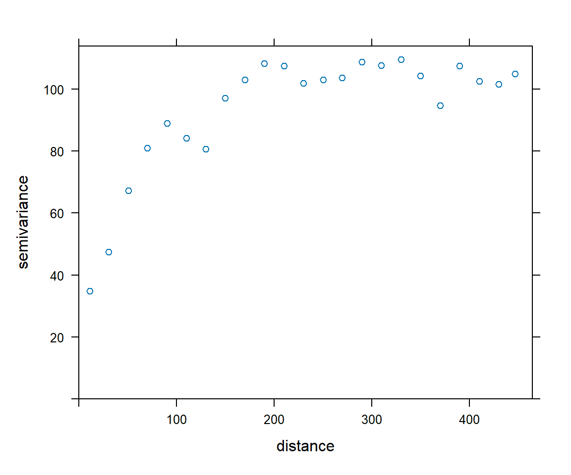 Compute the empirical variogram using the function \(\texttt{variogram()}\)