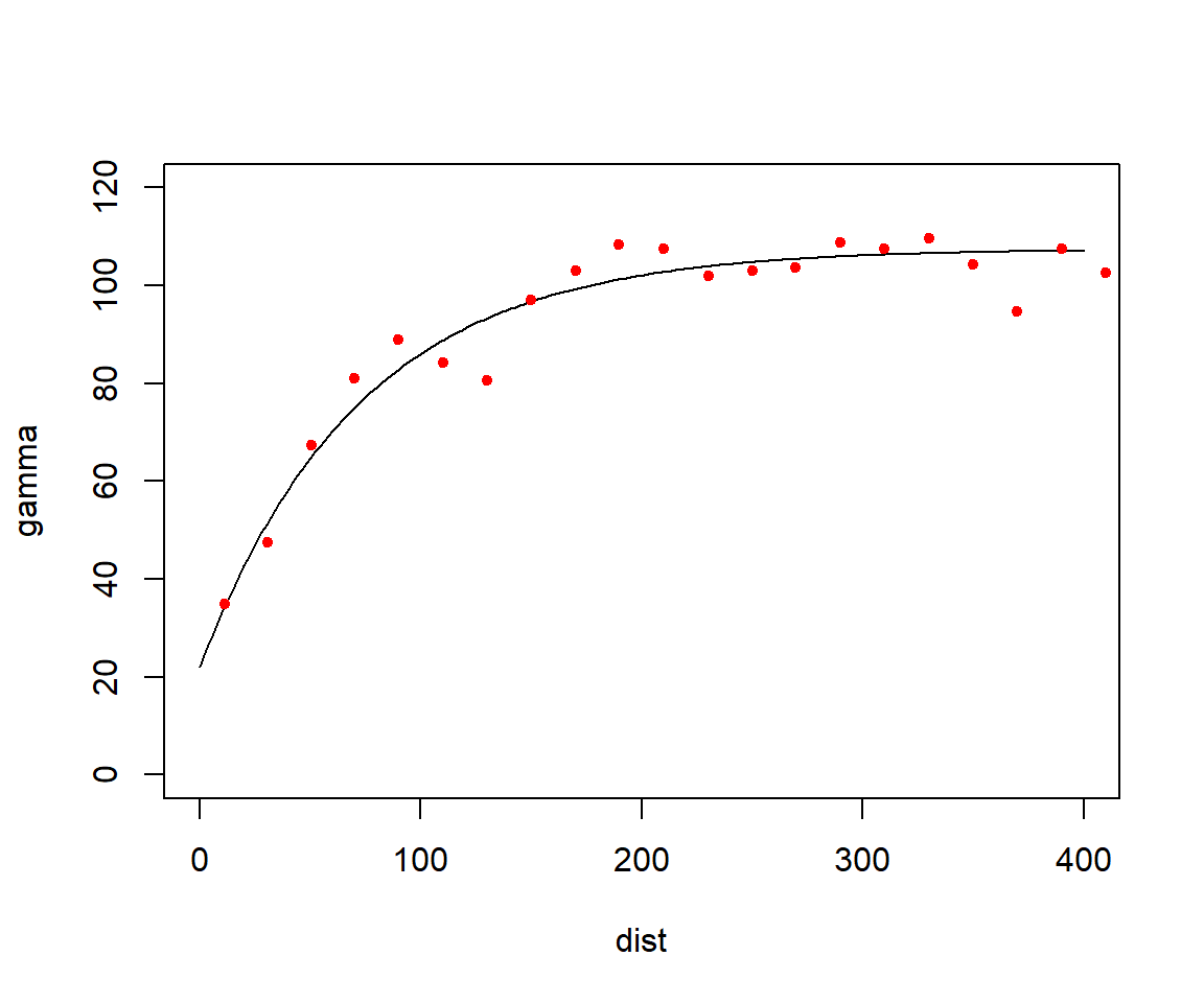 The next step is to choose an appropriate covariance function for modeling spatial dependence. While several types of covariance (or correlation) functions are available for spatial data, we will use the Exponential covariance function for its simplicity and effectiveness. It is defined as: