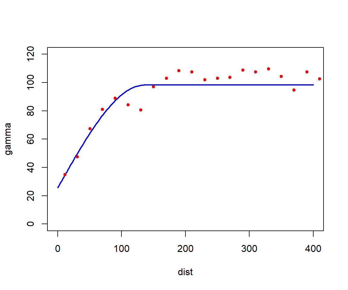 Fit a variogram model using the function \(\texttt{fit.variogram()}\)